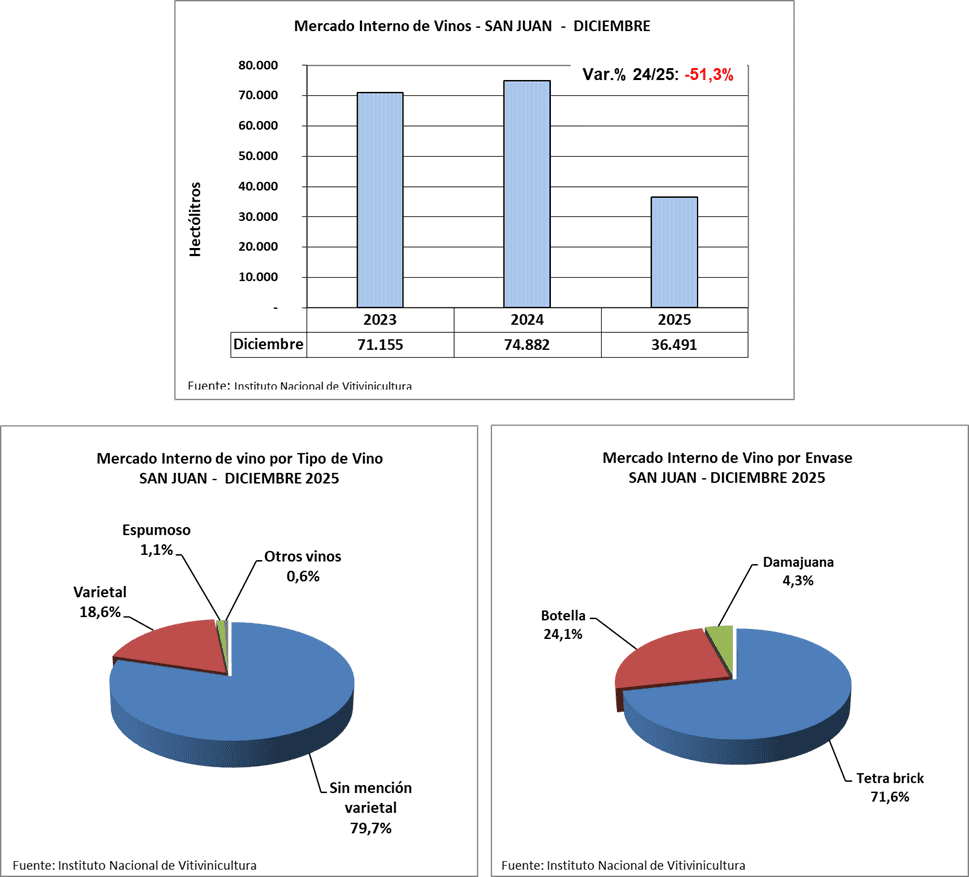 El volumen de vino enviado al mercado interno por San Juan continúa en disminución, siendo diciembre 2025 el noveno mes consecutivo de baja en las ventas respecto al año anterior. Este mes se despacharon 36.491 hl, lo que indica una disminución de -51,3% respecto al mismo mes del año anterior. El 79,7% del volumen de despachos corresponde a vinos sin mención varietal, disminuyendo -52,4% respecto al mismo mes del año anterior. El vino varietal, con una participación del 18,6%, disminuyó -49,3%. Disminuyeron los vinos color y blanco tanto de varietales como de vinos sin mención varietal. En el volumen total despachado en diciembre 2025 se registra disminución en vinos blancos (-55,5%) y vinos color (-48,8%) respecto al mismo mes del año anterior. El 71,6% de las ventas se despachó en envase tetra-brick; 24,1% en botella y 4,3% en damajuana.