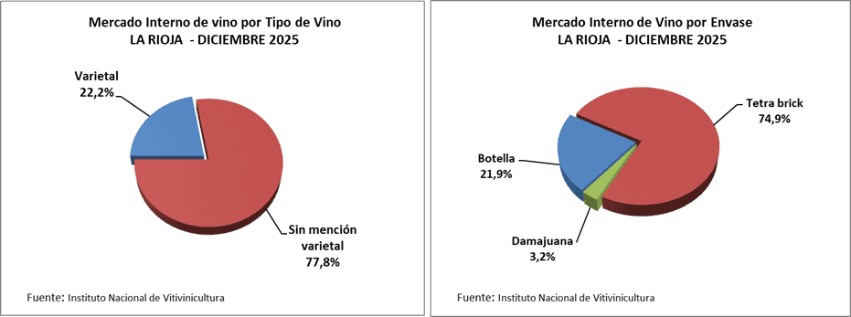 Las ventas en el mercado interno desde La Rioja en diciembre 2025 totalizaron 7.786 hl, registrando una disminución de -51,1% respecto al mismo mes del año anterior. Esta provincia acumuló una disminución de -17,5% en el año respecto al año anterior. En diciembre 2025, La Rioja despachó un 77,8% de vino sin mención varietal y 22,2% de vino varietal. El 74,9% de lo comercializado se despachó en tetra-brick; el 21,9% en botella y 3,2% en damajuana.