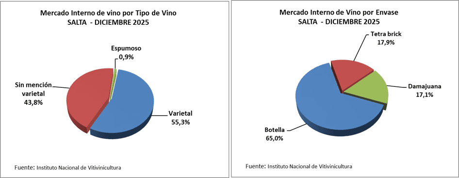 Los despachos al mercado interno desde Salta en diciembre 2025 fueron de 10.921 hl, registrando un aumento de +37,7% respecto al mismo mes del año anterior. Esta provincia termina acumulando una disminución de -7,5% en el año respecto al año anterior. En diciembre 2025 Salta despachó el 55,3% del volumen como vino varietal; 43,8% vino sin mención varietal y 0,9% vino espumoso. El 65,0% de los despachos fue en botella; 17,9% en tetra-brick y 17,1% en damajuana.