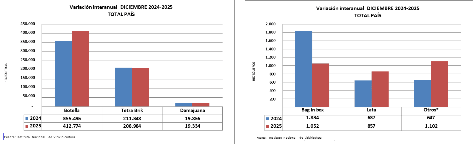 En el interanual diciembre 2024/ diciembre 2025, aumentaron los envases botella (+16,1%), lata (+34,6%) y “otros envases” (+70,3%), mientras el resto disminuyeron, tetra brick -1,1%, damajuana -2,6% y bag in box -42,7%.