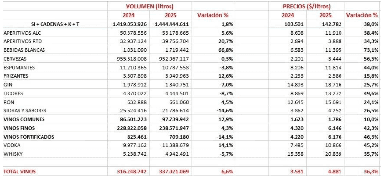Según datos procesados por el Observatorio Vitivinícola Argentino (OVA) -unidad ejecutora de la Corporación Vitivinícola Argentina (Coviar)- en base al relevamiento realizado por la consultora Scentia -que mide compras efectivas en el canal comercial-, las ventas de vinos en el mercado interno argentino lograron cerrar el año 2025 con un aumento en volumen del 6,6% contra el 2024, registrando un incremento en el precio promedio del 36,3%. La sorpresa del informe está en los resultados de venta por canal.