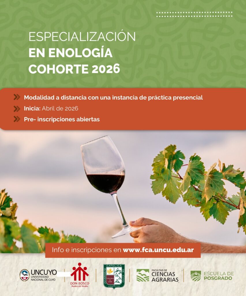La Facultad de Ciencias Agrarias de la Universidad Nacional de Cuyo (UNCuyo) y la Facultad Don Bosco de Enología y Ciencias de la Alimentación de la Universidad Católica de Cuyo (UCCA), se unen nuevamente para el dictado de la segunda cohorte del Posgrado «Especialización en Enología». Esta formación académica se dicta en modalidad virtual permitiendo una amplia participación federal de estudiantes desde distintas regiones del país. El dictado de clases comienza en abril de 2026 y hay tiempo para la inscripción hasta el 6 de marzo.