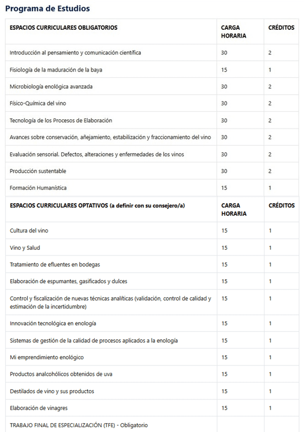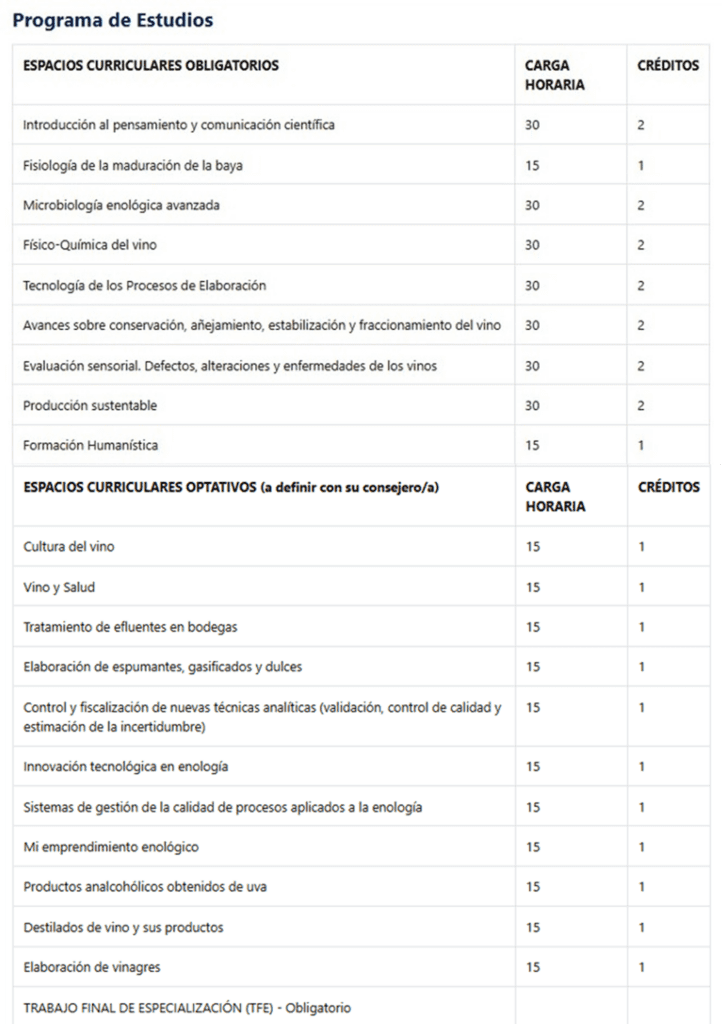 El posgrado, que tiene una duración de 12 meses, más 6 meses para la presentación del trabajo final. Está estructurado en módulos que abordan temáticas fundamentales, desde los procesos microbiológicos hasta la producción de bebidas destiladas. Incluye también el estudio de procesos para la elaboración de vinos orgánicos, biodinámicos y naturales, con una mirada puesta en la sustentabilidad de la vitivinicultura. Los destinatarios deberán ser profesionales con título universitario de grado afines.
