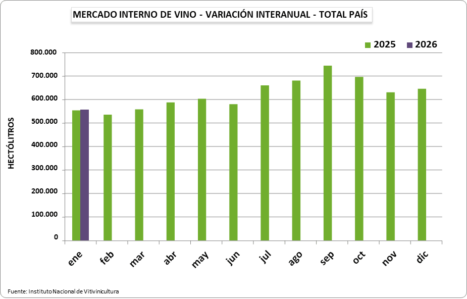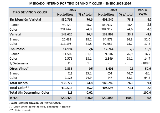 Las ventas de vino en el mercado interno durante el mes de enero 2026 alcanzaron un volumen de 555.883 hl, observándose un aumento de +0,6% respecto a igual mes del año anterior. Aumenta el volumen de vino sin mención varietal +4,9% respecto a enero 2025 alcanzando el 73,5% del volumen total de los despachos.