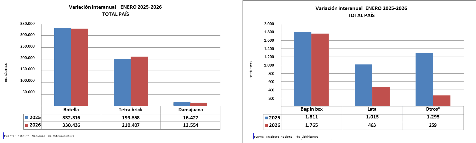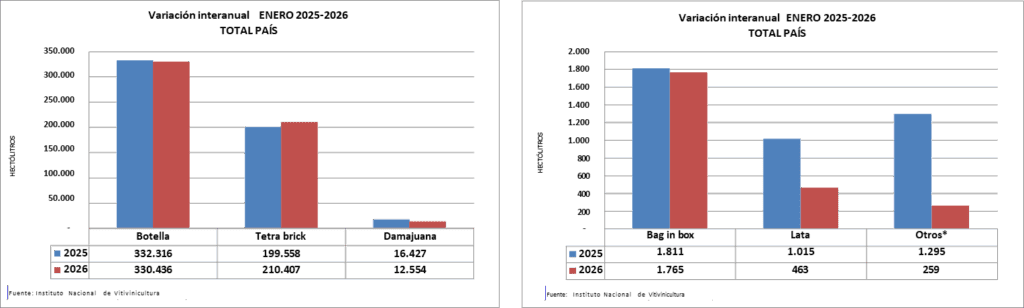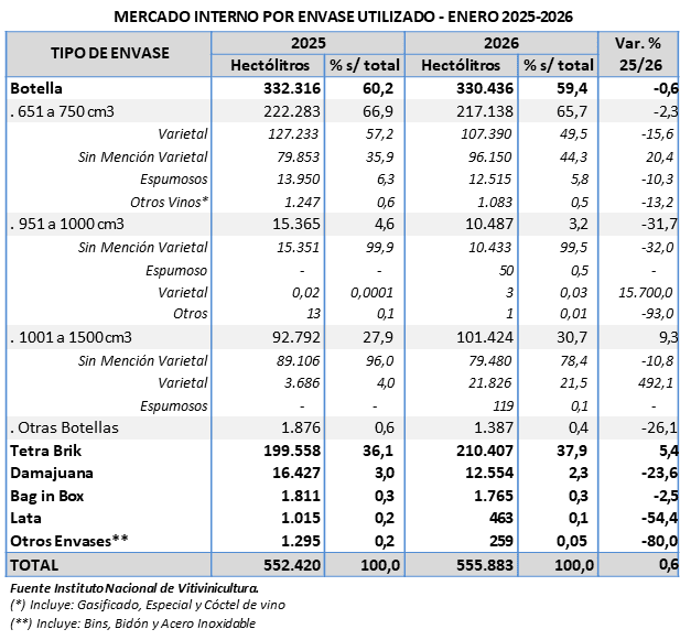 Los vinos sin mención varietal crecieron +16,4% y varietales +1,3%. El 62,0% de los vinos despachados por Mendoza en enero 2026 corresponde a botella, el 35,6% tetra brik; 1,9% damajuana; 0,3% bag in box y 0,1% lata.