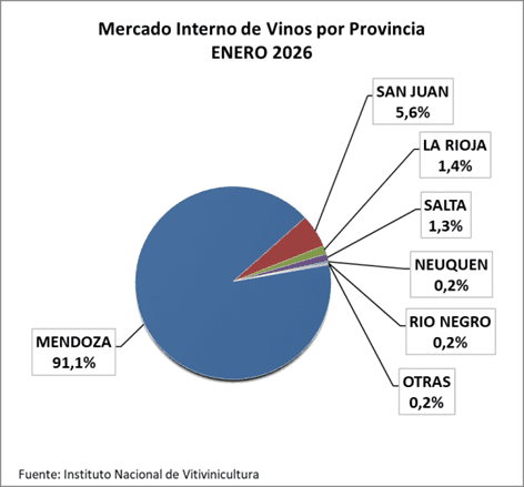 El 91,1% del vino comercializado en enero 2026 en el mercado interno se despachó desde Mendoza y el 5,6% desde San Juan. Sigue en importancia La Rioja (1,4%); Salta (1,3%) y luego Neuquén (0,2%) y Río Negro (0,2%). También despacharon las provincias de Bs As, San Luis, La Pampa, Catamarca, Córdoba, Jujuy, Entre Ríos, Tucumán y Chubut.