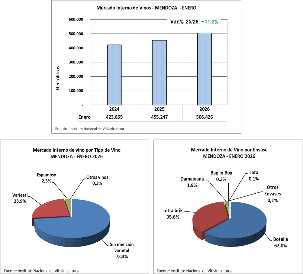 Los despachos de vino al mercado interno desde Mendoza en enero 2026 fueron de 506.426 hl, lo que evidencia un aumento de +11,2% respecto a igual mes del año anterior.