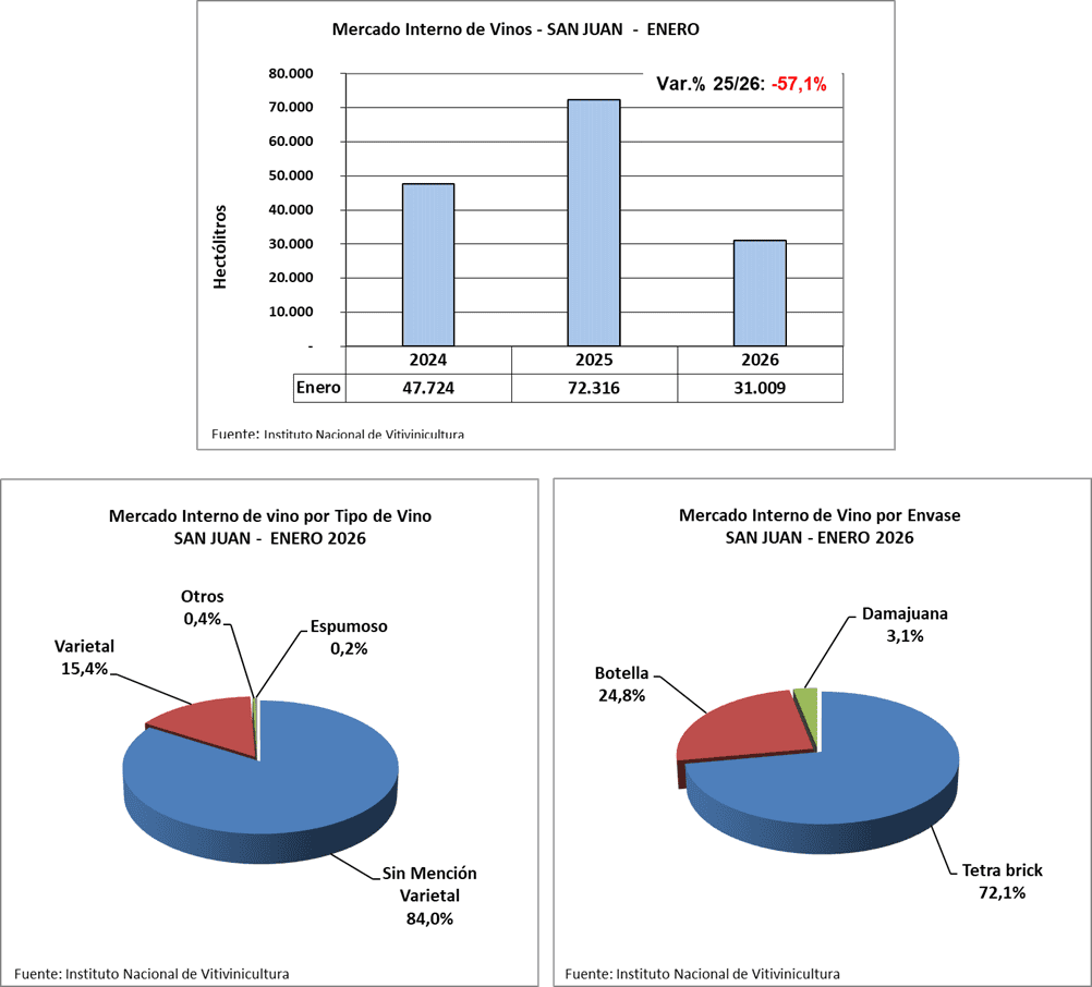 El volumen de vino enviado al mercado interno por San Juan continúa en disminución. En enero 2026 se despacharon 31.009 hl, un -57,1% menor al mismo mes del año anterior.