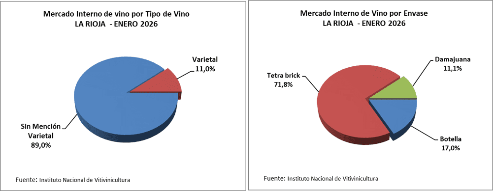 En enero 2026, La Rioja despachó un 89,0% de vino sin mención varietal y 11,0% de vino varietal. El 71,8% de lo comercializado se despachó en tetra-brick; el 17,0% en botella y 11,1% en damajuana.