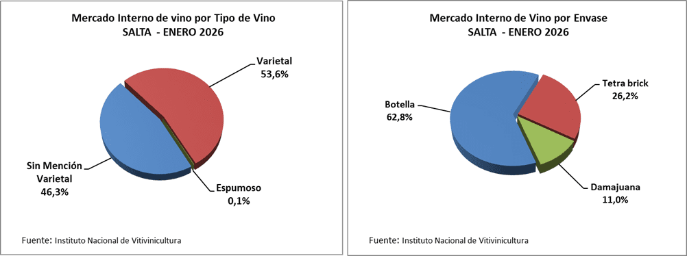 En enero 2026 Salta despachó el 53,6% del volumen como vino varietal; 46,3% vino sin mención varietal y 0,1% vino espumoso. El 62,8% de los despachos fue en botella; 26,2% en tetra-brick y 11,0% en damajuana.