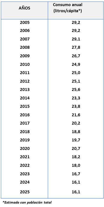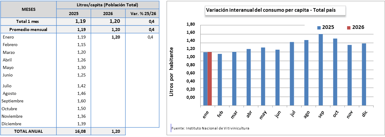 El consumo per cápita del mes de enero 2026 arroja un valor de 1,20 litros por habitante (población total país), lo cual indica un aumento de +0,4% respecto a igual mes del año anterior.