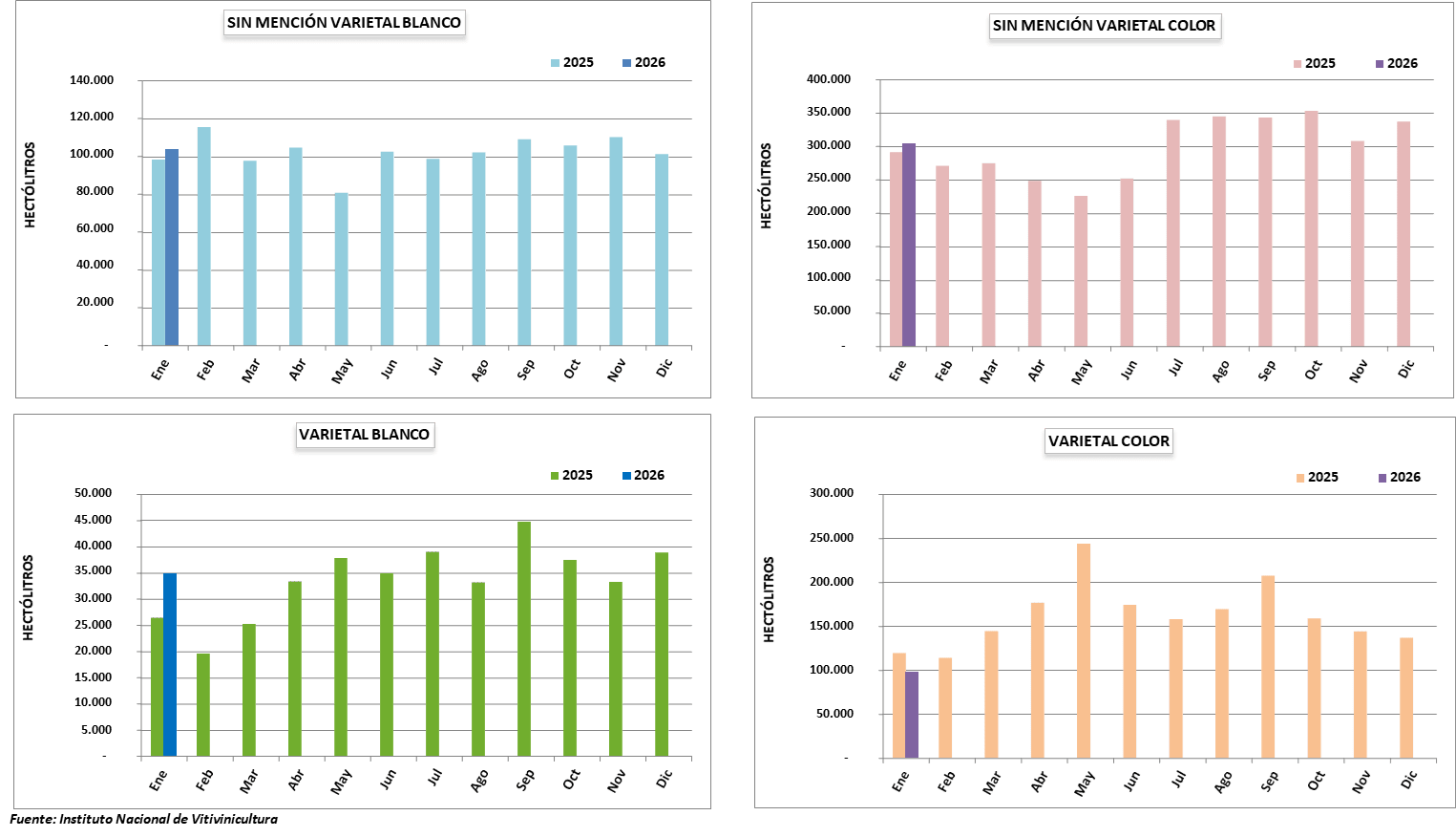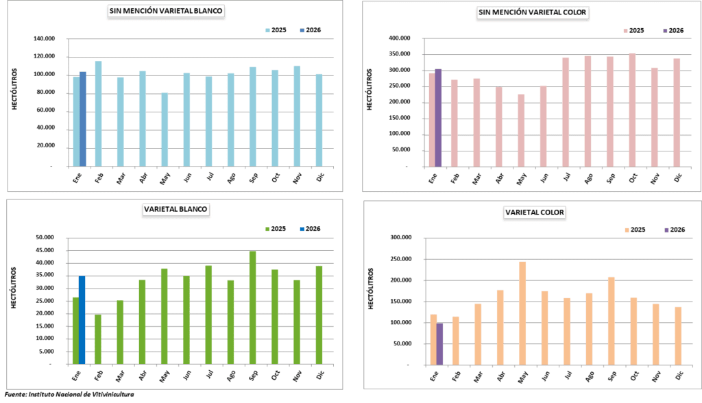 En enero 2026, se despachó un 47,3% del volumen como vino sin mención varietal; 45,3% vino varietal y 7,4% espumoso. El 96,8% se despachó en botella y 3,2% en bag in box.