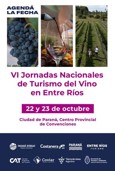 La Secretaría de Turismo, Ambiente y Deportes de la Nación, la Corporación Vitivinícola Argentina y el Gobierno de la Provincia de Entre Ríos organizan las VI Jornadas Nacionales de Turismo del Vino. La cita será en Paraná, Entre Ríos el 22 y 23 de octubre y en ésta edición se sumará el 1er Congreso Regional de Vitivinicultura, Enoturismo y Gastronomía.