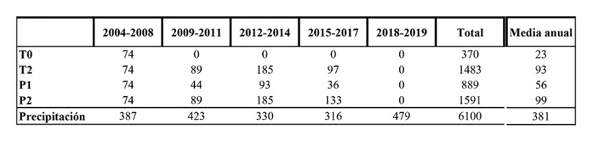 - 2004-2008: riego común del 20% ETo durante el verano, mediante sistema tradicional (T) o mediante sistema PRD – secado parcial de raíces – (P), en la línea, con una dosis media anual para todos los tratamientos de 74 mm.