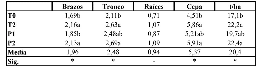 La aplicación continuada de riego produjo un aumento significativo de la madera acumulada con respecto al secano (T0), generando una diferencia de 5,2 t/ha en los tratamientos de mayor dosis (T2 y P2) y de 2,6 t/ha en el de nivel de riego intermedio (P1). Dicho aumento de madera se produjo en todos los órganos diferenciados de la cepa, lo que refrenda la dependencia de la disponibilidad de agua para generar biomasa.