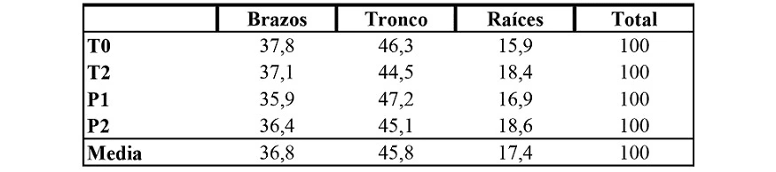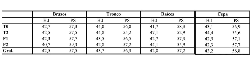 El contenido en humedad de la madera (tabla 3) fue similar en todos los tratamientos aplicados, tanto en el conjunto de la cepa como en cada uno de los órganos analizados. El porcentaje medio de humedad, ponderado según la aportación de cada parte al peso de la cepa, varió en conjunto entre 42,3% y 44,4%, mientras que como valores extremos observados en cualquier parte de la cepa se observaron el 40,7% en los brazos del P2 y el 47,1% en las raíces del T2, sin que las diferencias entre tratamientos resultasen significativas. Tampoco se apreciaron diferencias entre los distintos órganos, con una variación media entre 42,5% (brazos) y 43,7% (tronco).