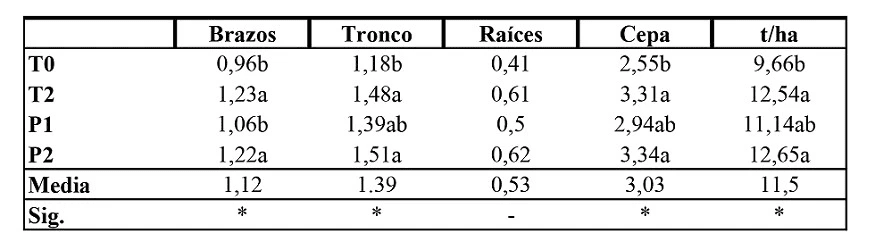 El aumento de madera derivado del riego se produjo en todos los órganos diferenciados de la cepa (brazos, tronco y raíces), mostrando diferencias estadísticamente significativas tanto en la cantidad total de madera como en las distintas partes u órganos de la cepa, excepto en las raíces. Dichas diferencias discriminaron los tratamientos más regados, T2 y P2, del secano (T0), sin discriminar el tratamiento de riego intermedio (P1) del resto, aunque en la parte de raíces las diferencias no llegaron a resultar estadísticamente significativas. En la parte de brazos el tratamiento P1 presentó menor peso fresco que T2 y P2, sin distinguirse del T0.