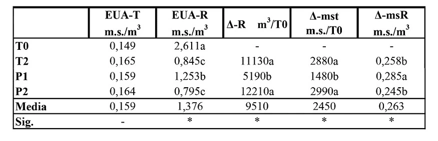 Teniendo en cuenta el incremento del agua de riego (Δ-R) con respecto al T0, denominado secano (sólo regado, de forma común, en el periodo de formación del viñedo, 2004-2008) y el incremento de materia seca producida con respecto a dicho tratamiento (Δ-mst), el incremento unitario de materia seca por volumen de agua de riego aplicada (Δ-msR) presentó valores en torno a 0,263 kg/m3, observándose diferencias favorables a P1 con respecto a T2 y P2, que promediaron un aumento del 16% del P1 con respecto al P2.