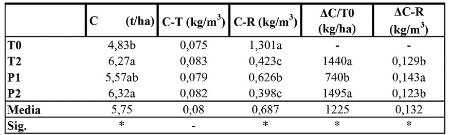 Teniendo en cuenta el incremento de la cantidad de carbono acumulada (ΔC/T0), en kg/ha, dependiente significativamente de la cantidad de agua de riego aplicada, con respecto al secano (T0), el incremento de carbono acumulado por volumen de agua aplicado con respecto a dicho tratamiento (ΔC-R), en kg//m3, presentó valores en torno a 0,132 kg/m3, observándose diferencias favorables a P1 con respecto a T2 y P2, que promediaron un aumento del 16% del P1 con respecto al P2.