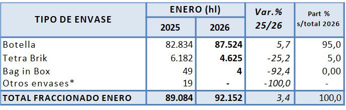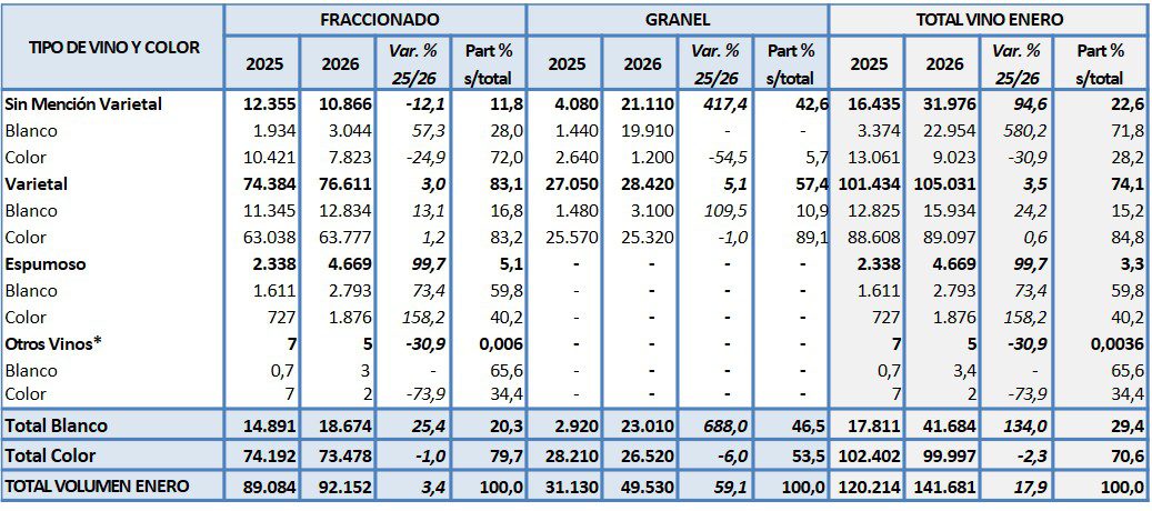 El Instituto Nacional de Vitivinicultura (INV), publicó el primer informe de 2026 sobre las exportaciones de vino. Al respecto, Argentina exportó durante el primer mes del año, 141.681 hl de vino (+17,9% que en 2025), a un valor FOB de U$S40.772.000 (+5,5%). La estrella fue el granel con un crecimiento respecto a enero de 2025 del 59,1%, marcado por el blanco que fue de +688%.