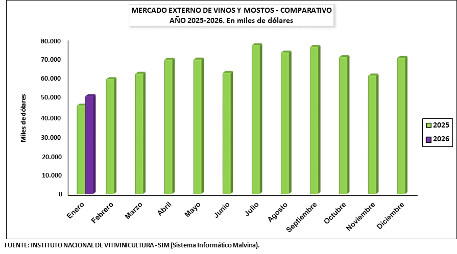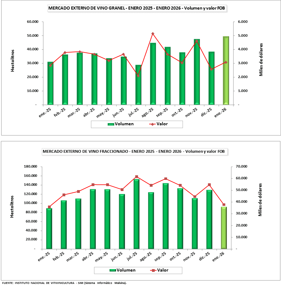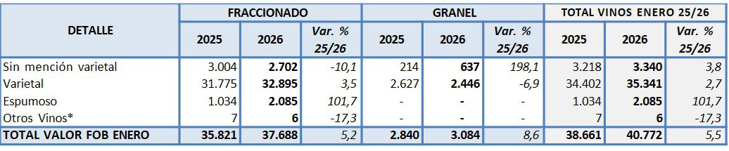 Argentina exportó en enero de 2026, 141.681 hl de vino (+17,9% que en 2025), a un valor FOB de U$S40.772.000 (+5,5%).