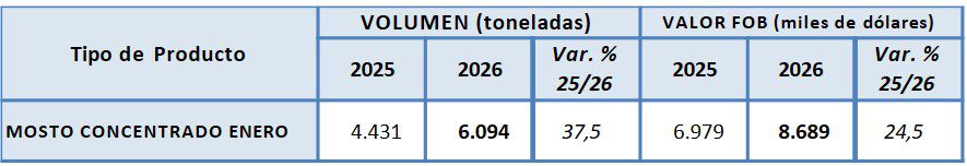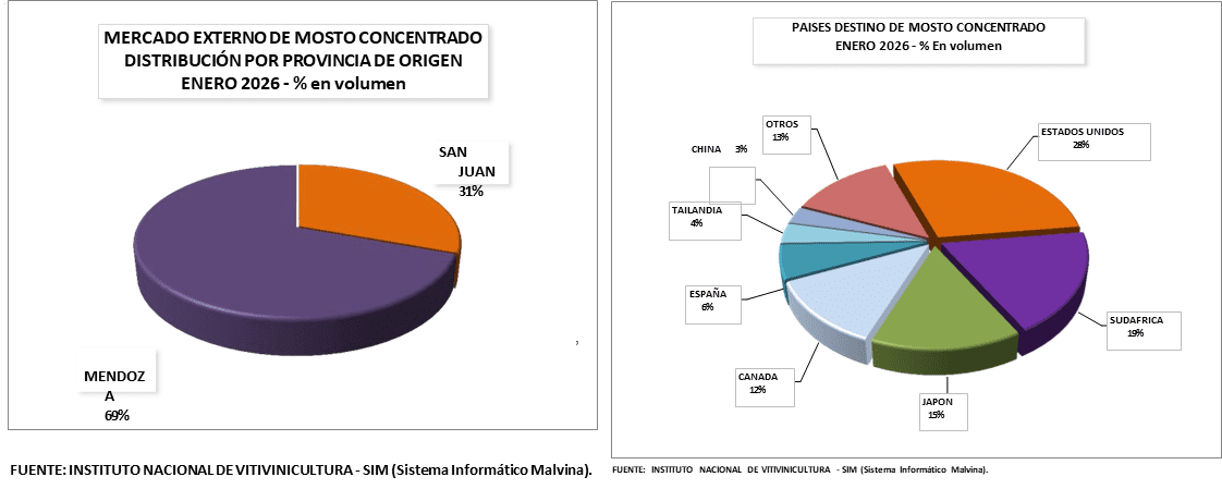 Las exportaciones de mosto concentrado en enero fueron de 6.094 toneladas (+37,5%)a un valor FOB de U$S8.689.000 (+24,5%). El 69% del volumen exportado es de Mendoza y el 31% de San Juan. Los cuatro principales destinos del mosto son EE.UU., seguido de Sudáfrica, Japón y Canadá.
