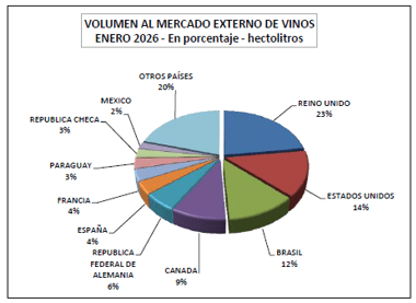 Los principales mercados de vinos fueron Reino Unido (23%), Estados Unidos (14%), Brasil (12%) y Canadá (9%)