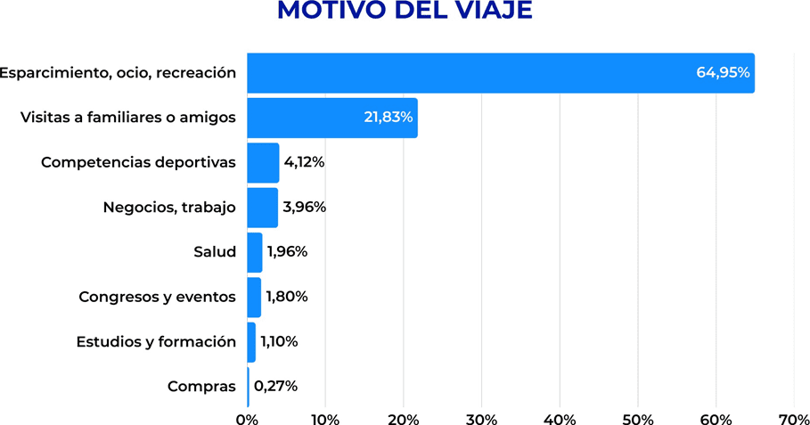 El informe confirma que Mendoza cuenta con una oferta turística multiproducto consolidada, capaz de atender los principales motivos de viaje de la demanda turística. El 65% de los visitantes llega por esparcimiento, ocio y recreación, mientras que el 22% lo hace para visitar a familiares o amigos. Este dato coincide con el comportamiento de la variable «forma de alojamiento utilizada», donde vivienda propia o de familiares y/o amigos representa el 32%.