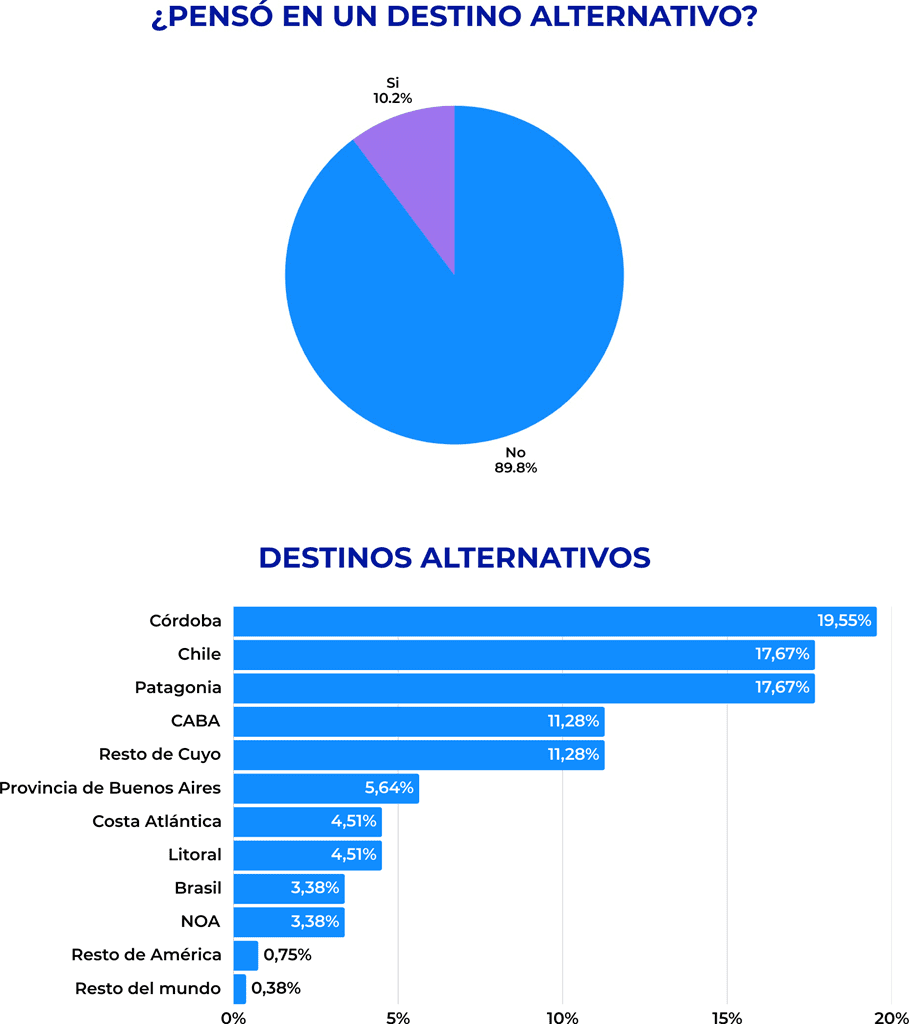 Entre quienes sí consideraron alternativas, las menciones se distribuyen de manera muy acotada y ninguna alcanza un peso significativo sobre el total de viajeros. Entre ellas aparecen CABA y Buenos Aires, Chile y la Patagonia, con valores cercanos al 2% cada una.