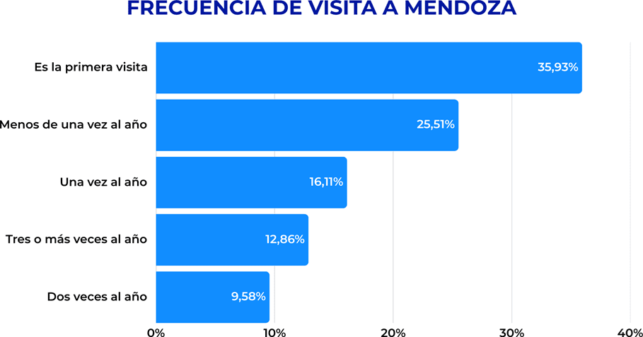 Al mismo tiempo, 36% visitó Mendoza por primera vez, un dato que confirma que el destino mantiene capacidad de promoción y de atracción de nuevos visitantes. Esta composición refleja un doble activo para la provincia: por un lado, una base de turistas que vuelve; por otro, la capacidad de seguir incorporando públicos nuevos.