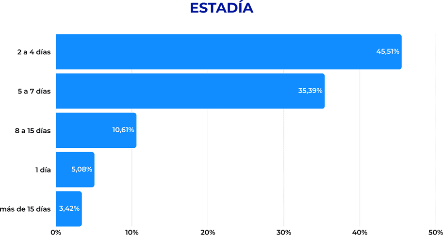 A la vez, 11% extiende su permanencia entre 8 y 15 días. Este comportamiento refleja una oferta turística capaz de adaptarse a distintos ritmos de viaje, con predominio de estadías cortas y medias.