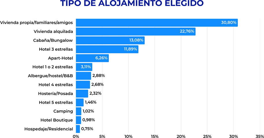 En cuanto al tipo de alojamiento, predominan la vivienda propia o la de familiares y amigos, con 31%, y la vivienda alquilada, con 23%. Luego aparecen las cabañas, con 13%; los hoteles 3 estrellas, con 12%; y los apart hotel, con 6%. A la vez, el segmento de alta gama concentra en conjunto el 7%.