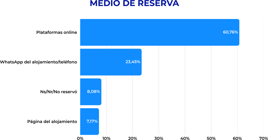 En menor medida, 12% utiliza la web del alojamiento y 8% no realiza reserva. Este comportamiento confirma la importancia de sostener una presencia digital activa, con información actualizada y canales de contacto ágiles.
