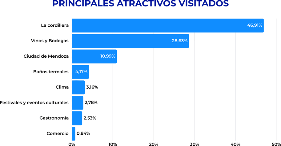 Más atrás aparecen las salidas nocturnas, con 9%, y el turismo aventura y las compras, con 7% cada uno. En conjunto, estos datos reflejan que la experiencia turística mendocina se organiza sobre dos grandes ejes: el disfrute del paisaje cordillerano y una oferta complementaria de vino, gastronomía, ocio y entretenimiento.