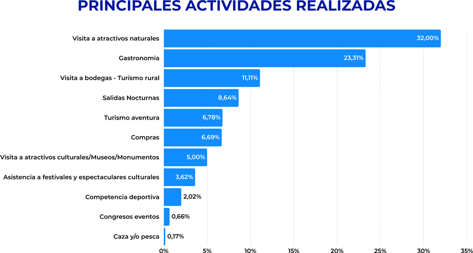 En línea con lo que los visitantes identifican como principal atractivo de Mendoza, las actividades más elegidas muestran un claro predominio de las experiencias vinculadas a la montaña y la naturaleza. La visita a atractivos naturales concentra el 32% de las preferencias, seguida por la gastronomía, con 23%, y por las visitas a bodegas, con 11%.