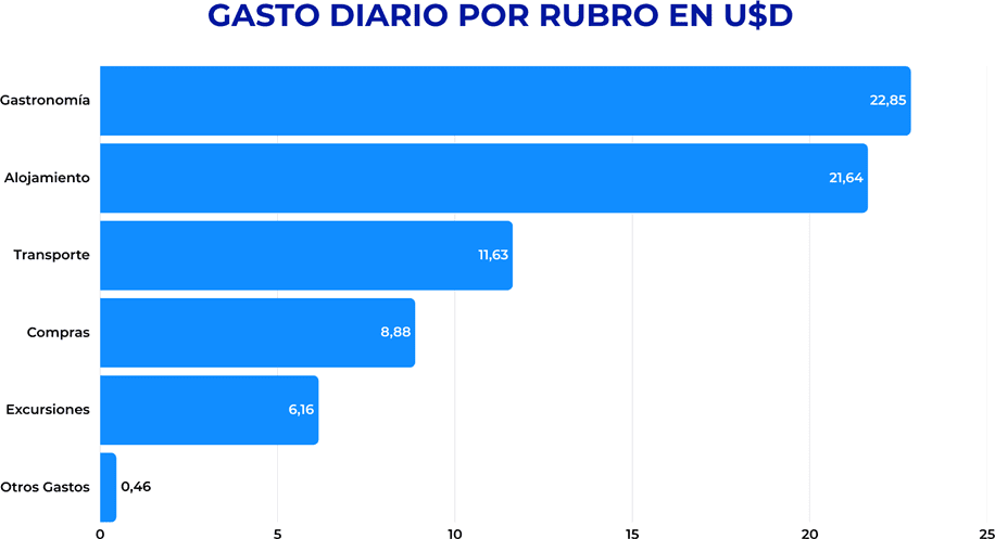 La gastronomía encabezó el gasto, con US$ 22,85 por día, seguida por alojamiento, con US$ 21,64, y transporte, con US$ 11,63. Esta composición confirma que mucho del impacto económico del turismo en la provincia se apoya en servicios que forman parte directa de la experiencia del visitante.