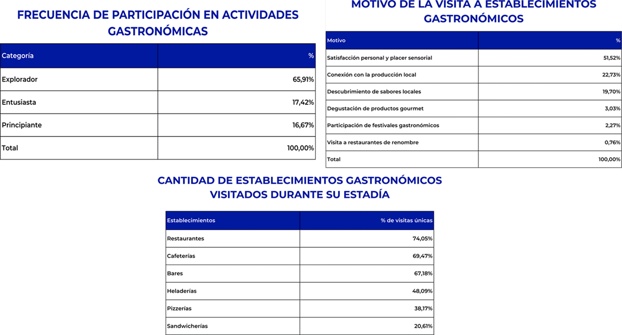 La gastronomía, por su parte, aparece no solo como un consumo asociado al viaje sino como una motivación central y un rasgo distintivo de Mendoza, con una propuesta de identidad propia, una experiencia sensorial muy valorada y un posicionamiento que también se fortalece a partir de la puesta en práctica del plan DIGAM, el incipiente desarrollo del oleoturismo y la presencia de la Guía Michelin en nuestra provincia.