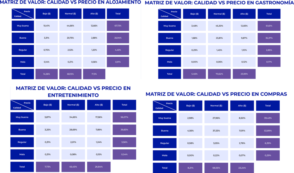 La gastronomía alcanza una valoración positiva de 96,98%, seguida por entretenimiento, con 95,90%; alojamiento, con 94,65%, y compras, con 93,32%.