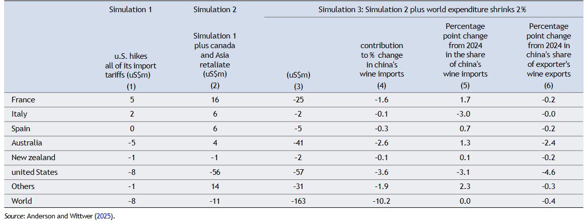 Un estudio de Anderson y Wittwer (2025), basado en su modelo global de mercados nacionales de bebidas (Wittwer y Anderson, 2020), proporciona estimaciones del impacto de estos choques recientes al sistema comercial mundial sobre las importaciones de bebidas de China. Aquí se resumen sus resultados en lo que respecta al comercio de vino, bajo tres simulaciones acumulativas: Simulación 1, los aumentos arancelarios de Estados Unidos del 2 de abril no provocan respuesta política por parte del resto del mundo; Simulación 2, Canadá, China y otros países asiáticos imponen aumentos arancelarios a sus importaciones de bebidas procedentes de Estados Unidos al mismo nivel que el aplicado por Estados Unidos a sus importaciones de bienes de esos países el 2 de abril; y Simulación 3, esas acciones y reacciones (más una posible represalia de la UE) generan mayor incertidumbre tanto para los hogares como para las industrias y provocan que el gasto agregado de los hogares se reduzca en el mediano plazo en un 2 % en cada país.