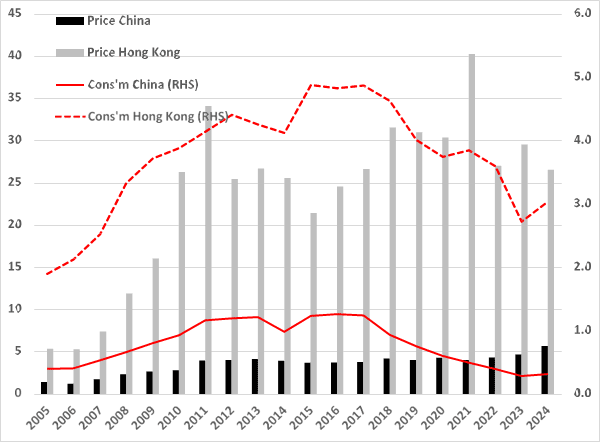 Un apoyo adicional a la idea de que existe un amplio potencial de expansión del consumo de vino en China se presenta en la Figura 8. Esta muestra que la cantidad de consumo aparente de vino en Hong Kong y su precio medio son más de cinco veces superiores a los correspondientes de la China continental. Estas diferencias no resultan sorprendentes, dado que el ingreso medio en Hong Kong es más de tres veces el del continente (y el del mundo), y que recibe proporcionalmente más turistas de alto gasto. El consumo de vino en Hong Kong en 2023 se situó cerca del promedio mundial de 2,7 litros per cápita y fue diez veces superior al de la China continental. El punto principal, sin embargo, es el potencial que ello revela para un crecimiento muy sustancial de las ventas de vino en China (así como en el Sudeste Asiático—véase Anderson, 2020) a medida que el ingreso per cápita aumente en las próximas décadas.