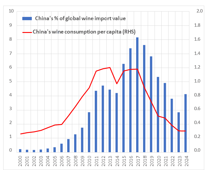 China fue una de las áreas de crecimiento más importantes del mundo en la demanda de vino durante la década de 2010, representando el 7% del consumo mundial de vino y el 8% del valor de las importaciones mundiales de vino en 2017. Sin embargo, el consumo per cápita de vino en China alcanzó su punto máximo a mediados de la década de 2010, y desde entonces sus importaciones de vino se han reducido a más de la mitad. Asimismo, las fuentes de las importaciones de vino de China han fluctuado considerablemente durante las últimas dos décadas, lo que convierte a este mercado en uno de alto riesgo para los exportadores de vino.