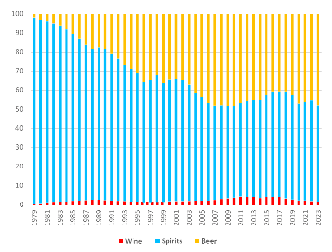 Sin embargo, desde mediados de la década de 2010, el consumo aparente de vino en China se ha desplomado, y lo ha hecho con la misma rapidez con la que había crecido hasta entonces. Ambas tasas de cambio tendenciales no tienen precedentes. La participación del vino en el consumo total de alcohol había aumentado del 1% al 4% durante los primeros 15 años de este siglo, pero para 2023 había regresado al 1,3% (Figura 2).
