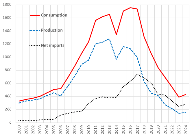 La producción nacional de vino, por su parte, alcanzó su punto máximo incluso antes que el consumo. Presumiblemente, los nuevos inversores descubrieron que el cultivo de uvas y la elaboración de vino no eran tan rentables como otras áreas de inversión. Esto se hizo sentir especialmente a medida que la competencia de las importaciones se intensificó durante la década de 2010, en particular desde Australia a partir de finales de 2015, cuando entró en vigor el Acuerdo de Libre Comercio China–Australia. Como consecuencia, la proporción de importaciones (netas de una cantidad insignificante de exportaciones) en el consumo de vino en China aumentó durante la década de 2010, pasando de alrededor de una quinta parte a casi tres quintas partes.