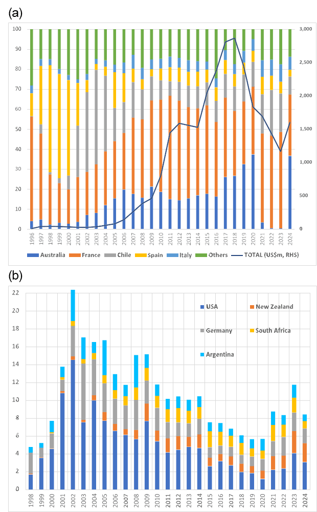 Los exportadores de vino australiano quedaron prácticamente excluidos del mercado chino debido a aranceles punitivos de hasta el 218% sobre sus vinos embotellados (anticipados a finales de 2020 y formalizados en marzo de 2021, tras una intensa labor de presión por parte de la Asociación China de Bebidas Alcohólicas). Por sí solos, estos aranceles contribuyeron poco a reducir las importaciones totales de China. Según la modelización de Wittwer y Anderson (2021), habrían reducido las importaciones totales en apenas un 1%, manteniéndose constantes las demás variables. No obstante, sí dieron a otros exportadores la oportunidad de aumentar sus participaciones en ese mercado en declive (Figura 6(a)).
