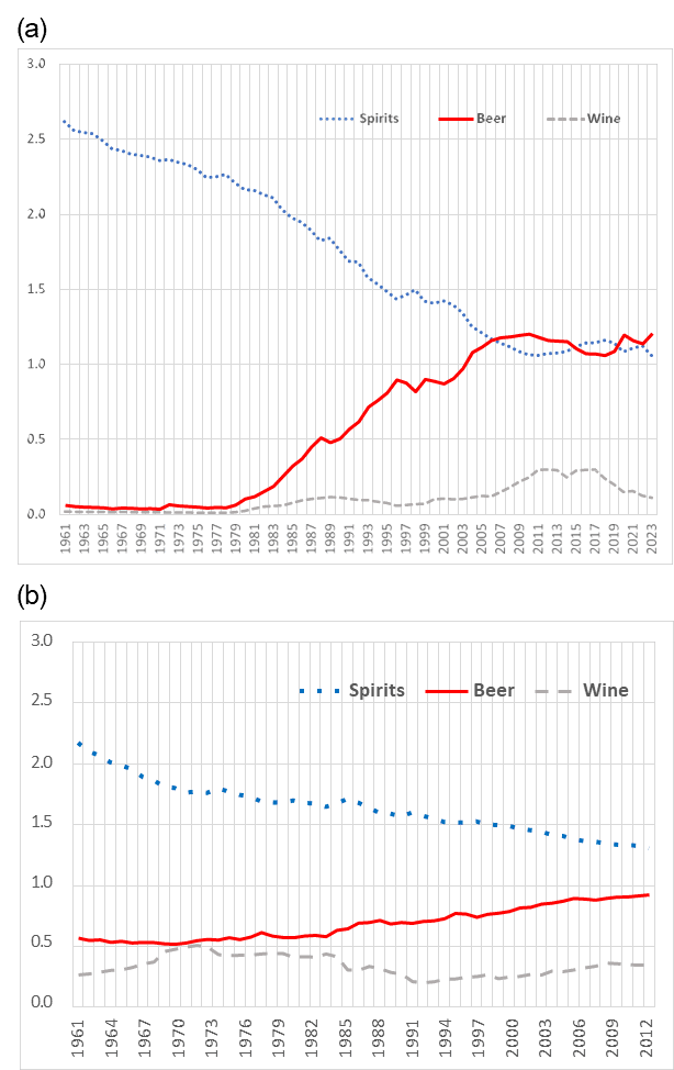 La apertura de la economía china en diciembre de 1978 desencadenó un fuerte crecimiento de los ingresos y una rápida urbanización, lo que impulsó la demanda interna de numerosos productos manufacturados, incluidas las bebidas alcohólicas. El consumo anual registrado de alcohol per cápita se más que triplicó durante las primeras cuatro décadas de la apertura: se duplicó en el caso de las bebidas espirituosas (hasta 2,0 L) y aumentó de casi cero a 1,4 L en el caso de la cerveza. El alcohol procedente del consumo de vino también aumentó, aunque desde una base ínfima en 1978 hasta un máximo de apenas 0,1 L de alcohol por año en la década de 2010 (Figura 2).