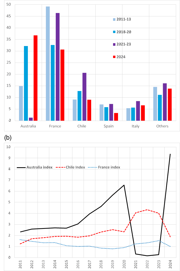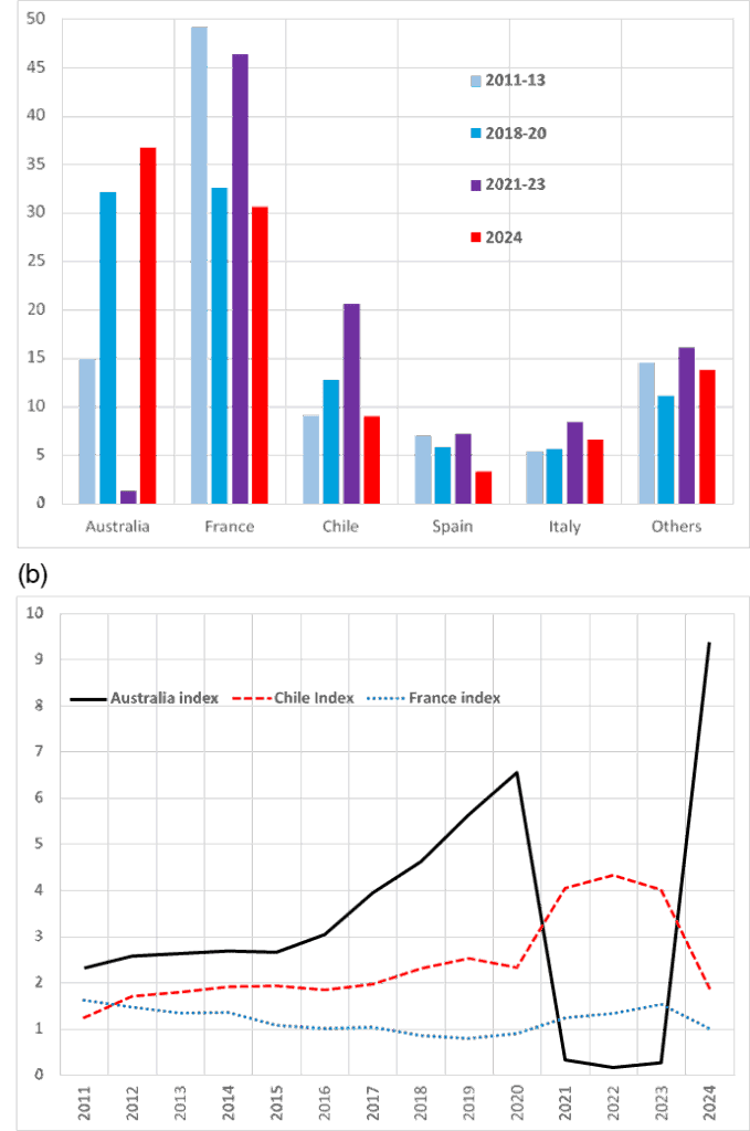 Entre 2018 y 2020, el vino australiano representó un tercio del valor de las importaciones de vino de China, es decir, aproximadamente seis veces la participación de China en las importaciones mundiales de vino (el doble de la intensidad registrada en 2015, cuando entró en vigor el Acuerdo de Libre Comercio China–Australia). Durante los tres años siguientes, Chile y Francia casi duplicaron cada uno la intensidad de su comercio de vino con China (Figura 6(b)). Cuando los aranceles al vino australiano se eliminaron a finales de marzo de 2024, Australia comenzó a recuperar gradualmente su posición dominante previa.