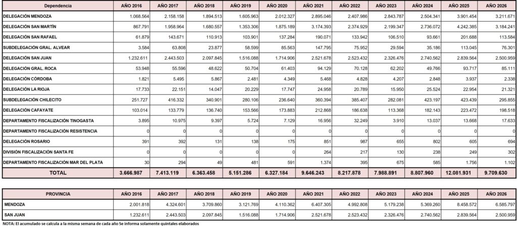 En 15 semanas de vendimia se sumaron 9.709.630 qq de uva, una cosecha 19,7% menor respecto del mismo período de 2025, cuando a ésta altura se habían obtenido 12.081.931 qq.
