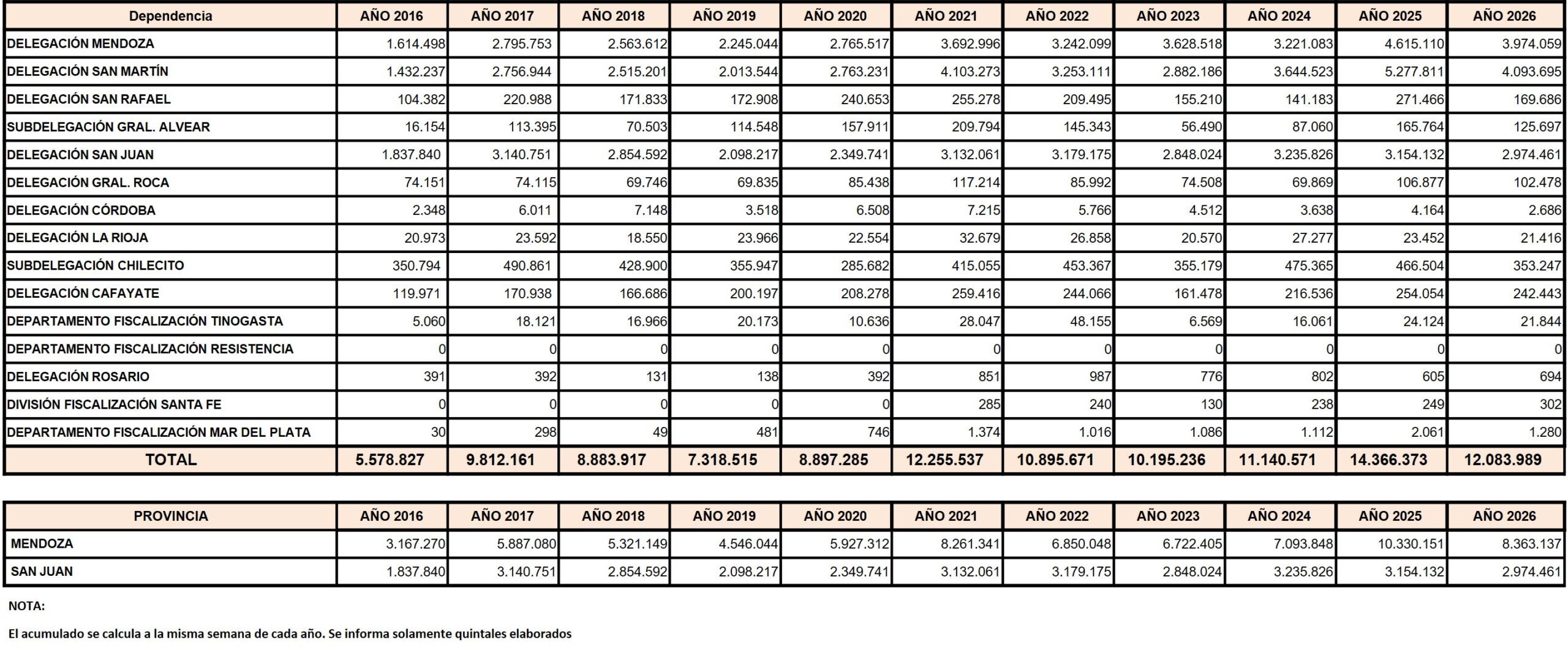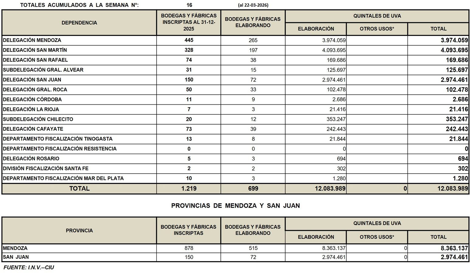Según las declaraciones juradas de los productores, recibidas por el Instituto Nacional de Vitivinicultura (INV), al 22/3 (semana 16 de iniciada la cosecha de vid), se recolectaron en Argentina 12.083.989 qq de uva, -16% que lo cosechado durante el mismo período de tiempo de 2025.