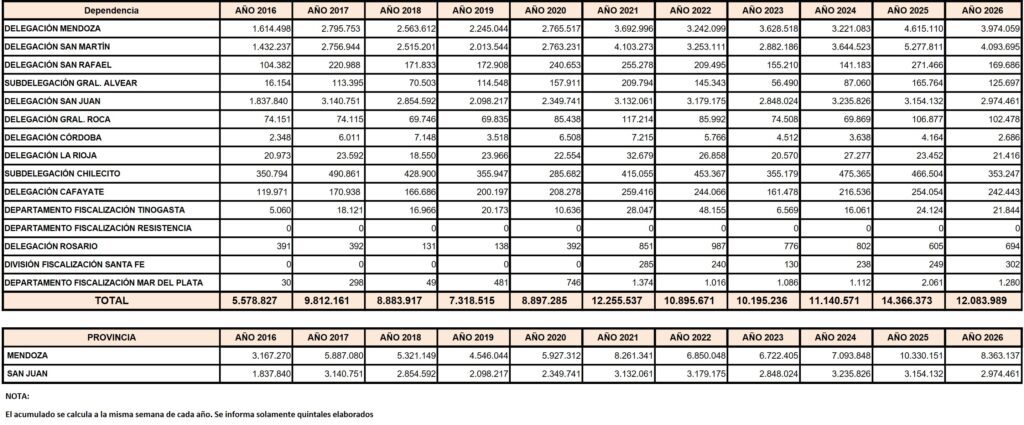 En 16 semanas de vendimia se sumaron 12.083.989 qq de uva, una cosecha 16% menor respecto del mismo período de 2025, cuando a ésta altura se habían obtenido 14.366.373 qq.