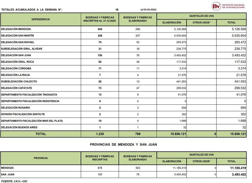 Según las declaraciones juradas de los productores, recibidas por el Instituto Nacional de Vitivinicultura (INV), al 5/4 (semana 18 de iniciada la cosecha de vid), se recolectaron en Argentina 15.606.121 qq de uva, -12,2% que lo cosechado durante el mismo período de tiempo de 2025.